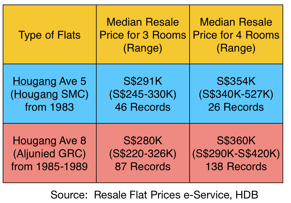 The best way to do this is to find out how the prices of the HDB flats in Hougang SMC and Aljunied GRC have fluctuated over the past twenty years. This dataset is difficult to collect and requires HDB to provide them. However, it turns out that we can look at the current 1-year resale transacted prices of flats in both areas and answer the question to a large extent. The aim of this HDB e-service is to “assist potential resale flat buyers and sellers in making informed decisions, taking into account the prevailing trends in the HDB resale market” (source: HDB). So, we did the following by looking at 2 sets of data: 3 room flats & 4 room flats from Hougang Ave 5 (under Hougang SMC) and Hougang Ave 8 (under Aljunied GRC) and computed the median prices. All transactions found in the data set are arms-length transactions which means that we exclude resale transactions that may not reflect the full market price, for example, I buy a flat from my parents at a reduced resale flat price. Hence HDB’s data is indicative of the real market prices. Here’s what we found: